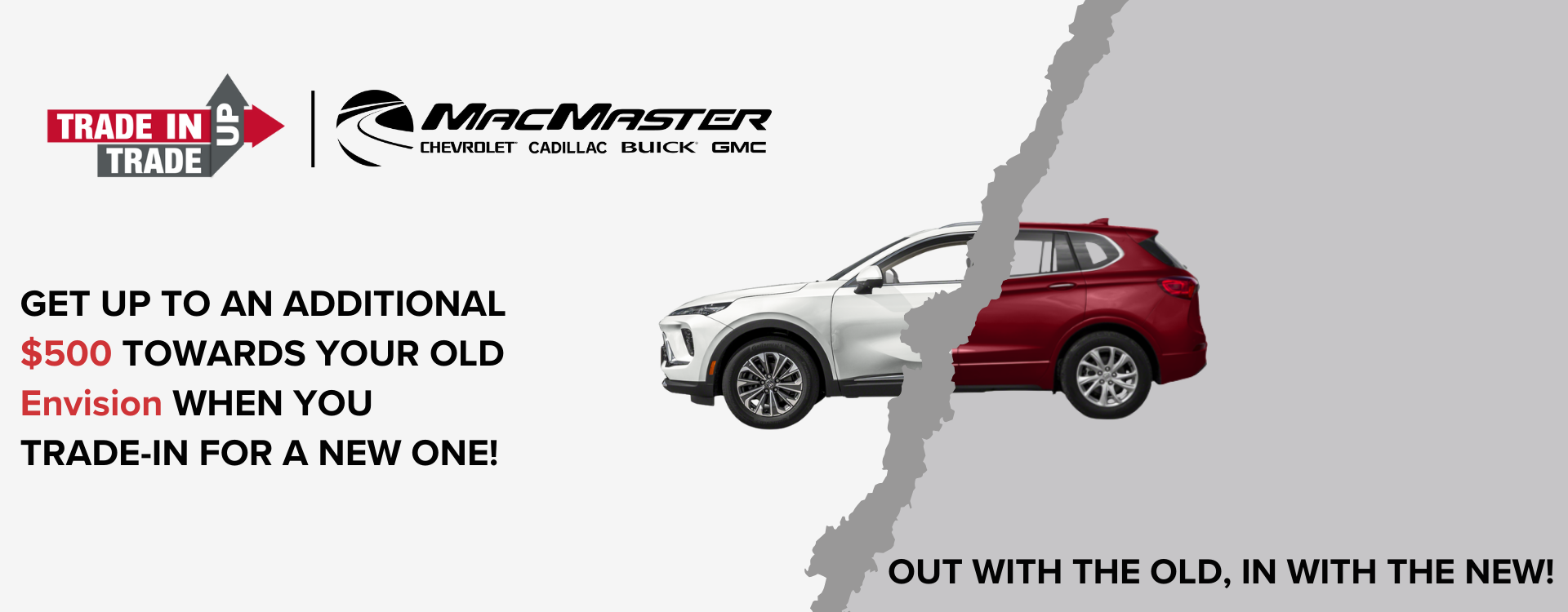 Receive an additional $500 Trade-In Bonus with qualifying vehicle trade-in before March 31st, 2021. Some conditions may apply - contact us for more details. All offers are valid with qualifying vehicle purchase, cash or lease only at MacMaster Chevrolet Cadillac Buick GMC Ltd.