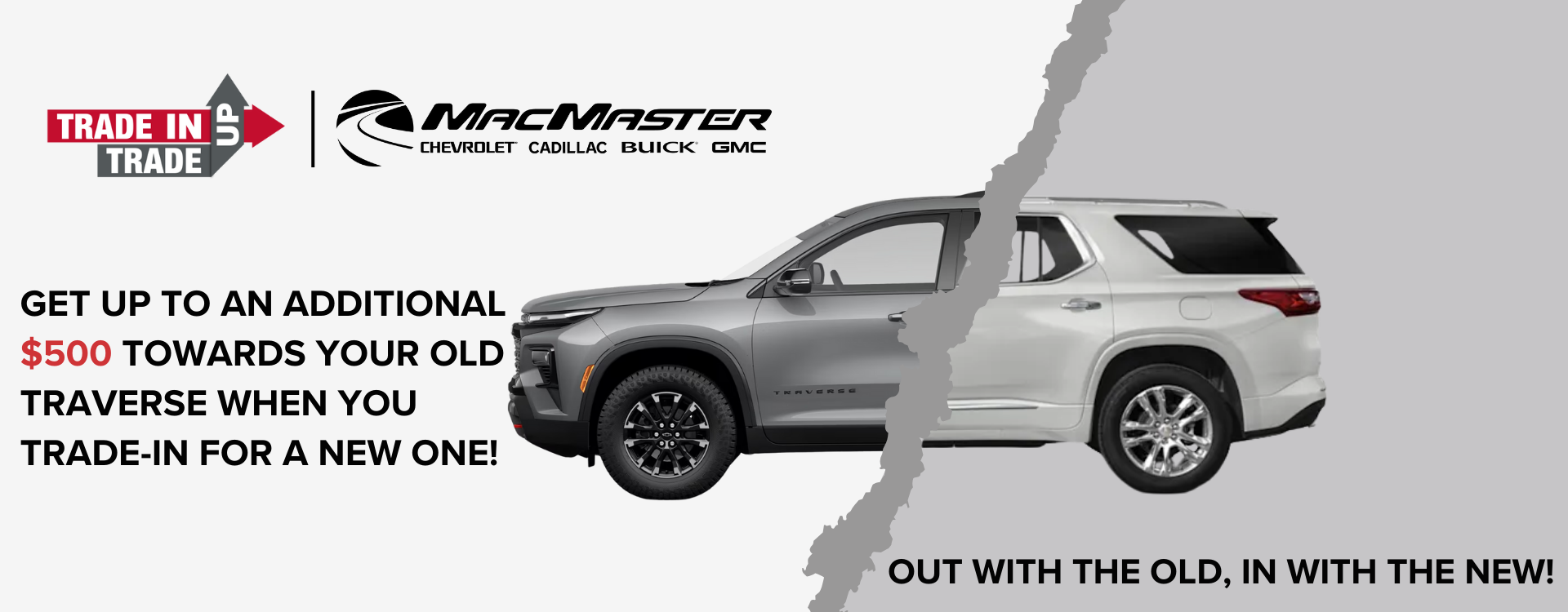 Receive an additional $500 Trade-In Bonus with qualifying vehicle trade-in before March 31st, 2021. Some conditions may apply - contact us for more details. All offers are valid with qualifying vehicle purchase, cash or lease only at MacMaster Chevrolet Cadillac Buick GMC Ltd.