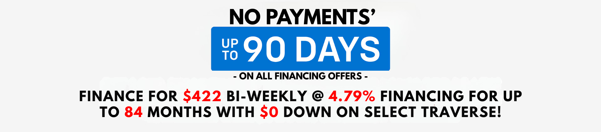 TRAVERSE FINANCE: Offer available to qualified retail customers in Ontario on select vehicles purchased and delivered from March 2, 2021 to March 31, 2021. 1.99% purchase financing (1.9% APR) offered on approved credit by TD Auto Finance Services, Scotiabank® or RBC Royal Bank for 84 months on eligible 2021 Traverse LT All-Wheel Drive models, includes Stackable Cash Delivery Allowance of $500 (Tax Inclusive). Participating lenders are subject to change. Rates from other lenders may vary. Down payment, trade and/or security deposit may be required. Monthly payment and cost of borrowing will vary depending on amount borrowed and down payment/trade. Example: $45,800 financed at 1.9% nominal rate (1.9% APR) equals $585 monthly for 84 months. Cost of borrowing is $3,302, for a total obligation of $49,101. Freight ($1,900) and air conditioning charge ($100, if applicable) included. License, insurance, registration, PPSA, applicable taxes and dealer fees not included (all of which may vary by dealer and region). Dealers are free to set individual prices. Factory order may be required. Limited time offer which may not be combined with certain other offers. General Motors of Canada Company (GM Canada) may modify, extend or terminate offers for any reason, in whole or in part, at any time, without notice. Conditions and limitations apply. See dealer for details. These offers may not be redeemed for cash and may not be combined with certain other consumer incentives. Conditions and limitations apply. Void where prohibited. Chargeable paint costs may vary depending on the vehicle/colour. See Dealer for full program details. ®Registered trademark of The Bank of Nova Scotia. RBC and Royal Bank are registered trademarks of Royal Bank of Canada. TD Auto Finance is a registered trademark of The Toronto-Dominion Bank.